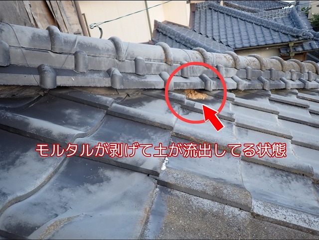 そんなモルタルが今回は劣化おこして、剥がれてしまっとる状態😭剥がれを放置しておくと、中の土が流出してきたり、その影響で棟瓦の崩れや落下。さらに、雨漏りの危険性まででてくるけん注意が必要ばい⚠️
