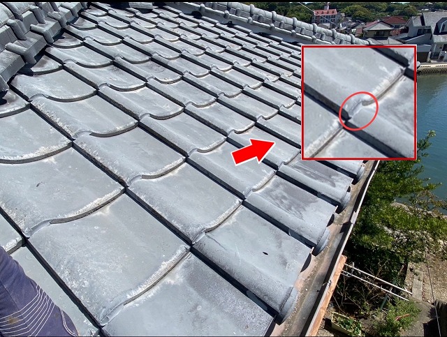 長崎市 土が漏れた棟を漆喰工事・海沿いによる強風でズレている瓦をラバーロック工法を施工します!