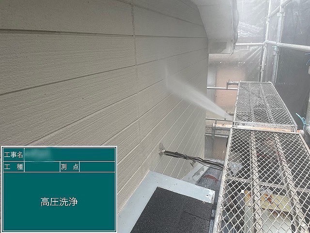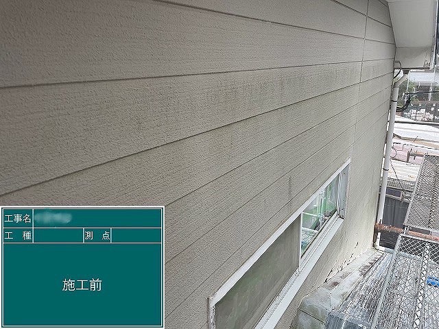 施工前の外壁は汚れが目立ち、チョーキングといい、触ったら白くなる現象があったよ💦よくフェンスとか触ったら手が白くなるような現象と一緒で外壁にもそのような現象が起きるっちゃんね、、、。お住いの外壁がそうだったら、ちょっと嫌よね、、まずはこの汚れやチョーキングなどの原因になる粉などを取り除いていくばい★