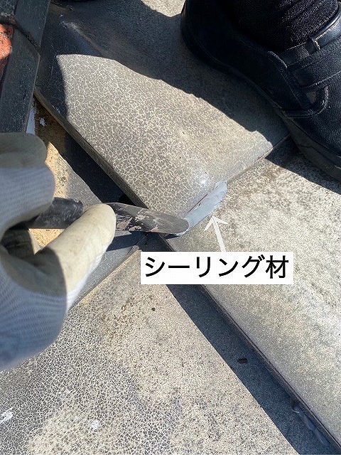 シーリング材を使用する場合は、瓦の山なり部分や縦面のみに使用することがポイント🙌何故かと言うと、全て瓦の面をシーリング材で囲ってしまったら、逆に雨水などのが侵入した時の逃げ道がなくなってしまうとさね😭やけん、絶対に全ての面には使用せんとよ❌