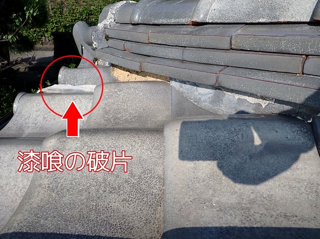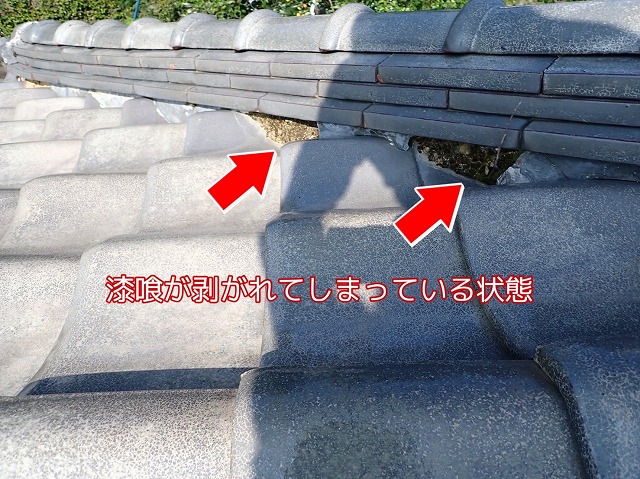 まず、業者からの指摘も多かった「漆喰」の状態ば確認していくばい★現状は、漆喰が剥がれてたり、破片が屋根に落ちとる状態😭コケも発生しとって、そのままでは雨漏りの危険性も出てくるよ⚠️