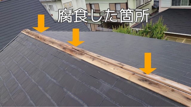 まず、こちらのお住いの棟板金がなぜ、指摘されたかと言うと…棟板金の下地が腐食して固定力が低下し、棟板金を浮き上がられせたことが問題やったよ😞下地は木材で使用しとるけん、どうしても年月が経つにつれて腐食しやすいとさね…