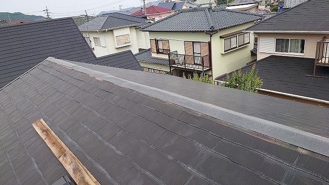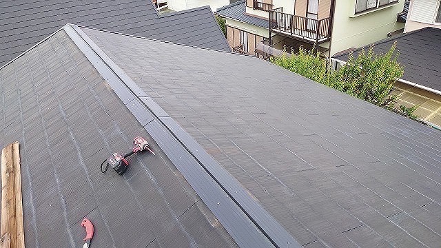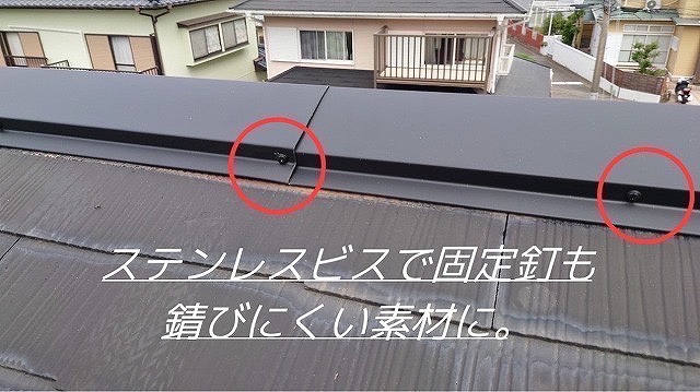最後に棟板金を取り付けていくとけど、施工前はトタンといって錆びやすい素材ば使用しとったとさね!!でも今回は【ガルバリウム鋼板】を使用して、サビに強く耐久性にも優れとる素材ば取り付けていくばい🫡固定釘も錆びにくいステンレスビスを使用して、棟板金の不具合を軽減★これにて棟板金張替え工事は完了✨️費用は70,000円だったよ😊低コストで屋根の耐久性や安全性を保てるけんオススメな工事ばい😙