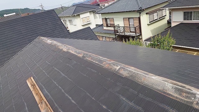 🏠お住い情報🏠築30年以上木造二階建て住宅屋根材 スレート屋根今回は訪問業者から棟板金の指摘があり、気になってこちらにお問い合わせを頂いたばい★棟板金とは、屋根のてっぺんにある棟という所に雨漏りを防ぐために取り付けられている金属製のカバーのこと‼️この棟板金のトラブルは数多くお問い合わせがあって、危険性も高いことが多かとよ😖