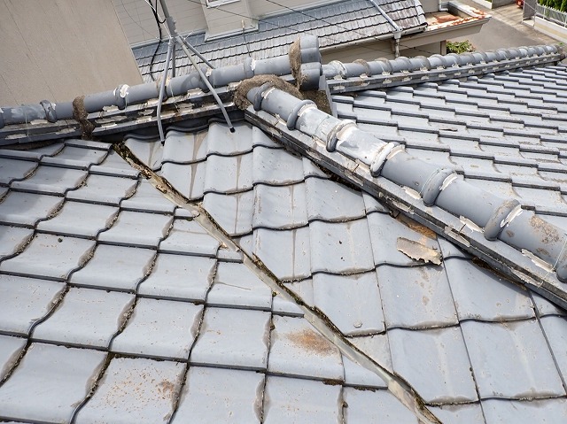 梅雨時期によく見られる屋根の劣化の1つとして【漆喰の剥がれ】です。まず漆喰とは、屋根の「棟」と言われる箇所に使用されており、雨水を屋根内部に侵入をさせないようにしている大事な役割があります!重大な役割がある漆喰ですが、経年劣化とともに剥がれやひび割れを引き起こします。