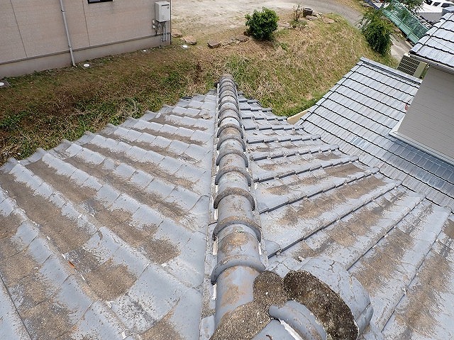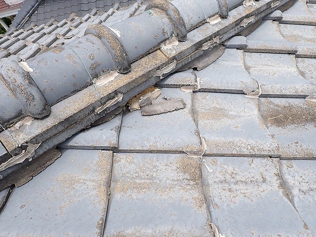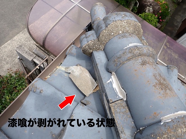 この写真のように漆喰が剥がれ、中の土台の土が丸見えになっている場合、梅雨のように雨が大量に降ってしまった場合、中の土台の土が全て流れでてきてしまう状態になってしまいます😭この土台となる土は、棟の瓦全体を支えている土台になる為、流れてしまったら大変危険な状態になってしまいます。