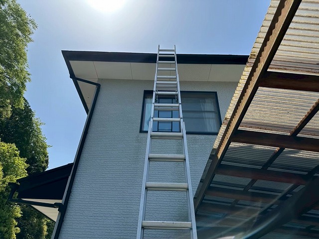 現場調査を行う際には、ハシゴを使って屋根に登って行いますよ!ハシゴが倒れないように、しっかりと固定をして登っていきます!さっそく屋根に登り現場調査を行っていきますよ!