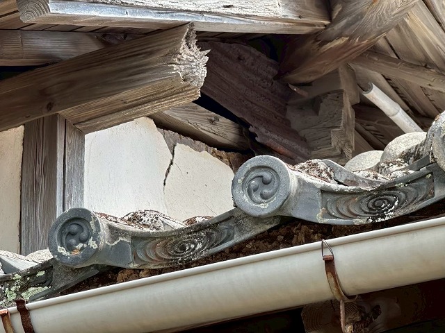 漆喰が剥がれて下地の木材が見えてしまっています。長年の経年劣化で漆喰にひび割れや剥がれがでてきてしまいます。築年数が経つと、建材のたわみやゆがみが進行し、それに漆喰が耐えきれなくなってひび割れしてしまう事も(>_<)