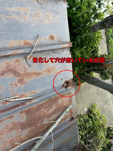 こちらの現場では、錆だけだはなく劣化して穴が開いてしまっていました。この穴から雨水が内部へと侵入して雨漏りしている状態ですね。触るとポロポロと錆びたトタンが取れてしまいます。
