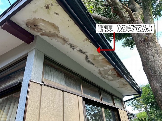 雨水が侵入しているので、軒天に雨染みが多くある状態でしたよ(>_<)家の中にも雨染みがあるようでした。このように雨漏りしている状態では、補修工事ではなく、屋根の張り替えが必要となります!