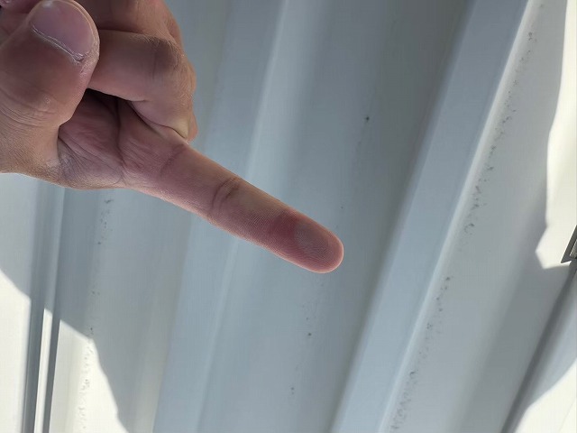 塩ビ鋼板を触ってみると、塩ビ鋼板の表面を覆う塩化ビニル樹脂(PVC層)が紫外線や風雨で分解・粉化していたした。ですので、手で触ると白く粉が付いています。よく外壁などを触ると手が汚れるのと同じような現象ですね!