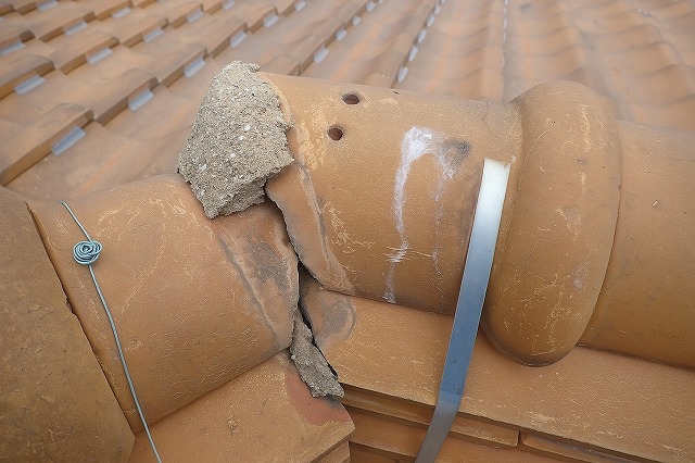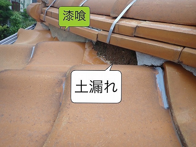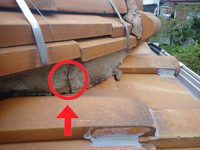 2つ目に多いのか、【土台の漏れ】です。漆喰は棟に使用されている土台が流れ出さないように固定しているものです。その漆喰が経年劣化など先程紹介してひび割れが酷くなったりした場合、剥がれてきてしまいます😭剥がれてしまうと、土台がむき出しになり、流れ出してくる場合があります…。土台が流れ出してしまうと、棟の瓦が崩れ落ちてしまう。という危険な状態になる為このような場合は早めの処置が必要です😌