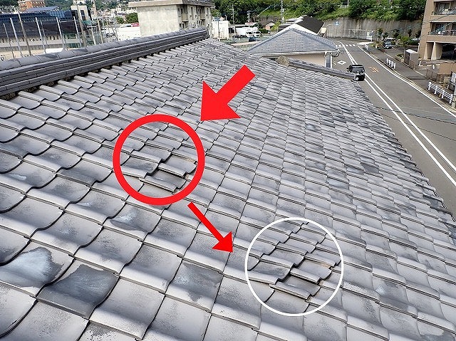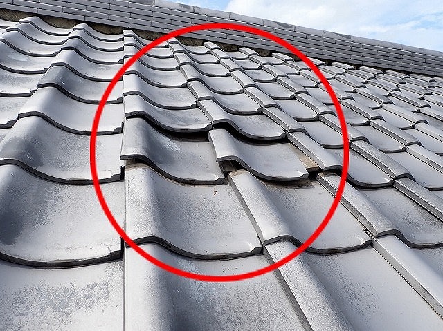 こちらは、台風被害により瓦がズレてしまったお住いです。台風の影響は甘くみれませんね😭このようなズレを放置していると、瓦の落下の危険性は勿論ですが、この隙間から屋根内部に雨水が侵入し、雨漏りの危険性も出てきます。