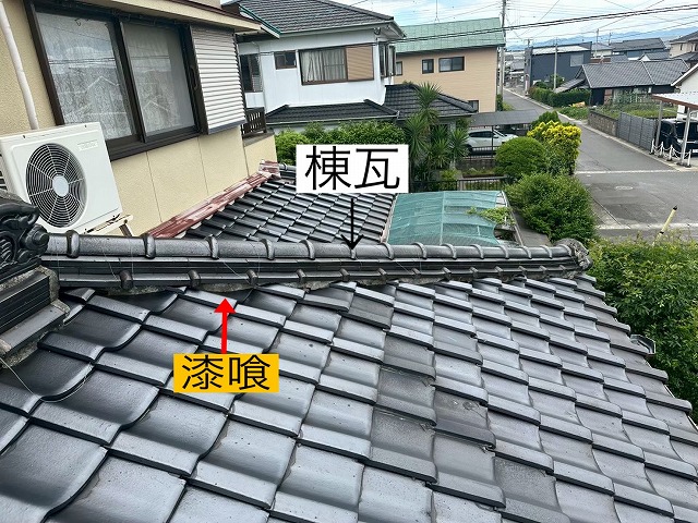 漆喰は、棟瓦に使用されています。棟は、斜めに下った隅棟と呼ばれる部分になります。土や瓦で屋根からの雨漏りを防いでくれている部分ですよ!