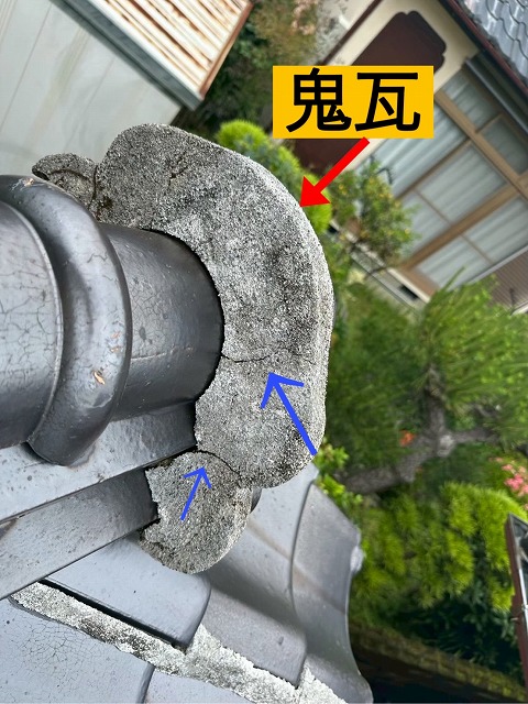 棟瓦の先端には、鬼瓦が使用されていますよね!鬼瓦の上にも漆喰は使われていますが、劣化でひび割れを起こしています。築年数50年だと漆喰も劣化してポロポロと剥げてしまい、棟瓦が崩れてしまうこともあります。漆喰は、長くみて20年前後では、補修をオススメしていますよ!15年程で漆喰の補修を行うと雨漏りや崩れよ予防になりますよ!