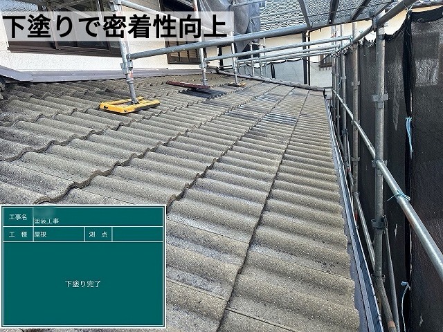 高圧洗浄後、十分に乾燥させてから 下塗り をしていくばい😊モニエル瓦は✅ 塗料の吸い込みが非常に激しい✅ 専用下塗り材が必須という屋根材⚠️下塗りを丁寧に施工することで👉 上塗り塗料の密着性UP👉 塗膜の耐久性UP長持ちする屋根塗装の土台を作っていくとよ🏠✨