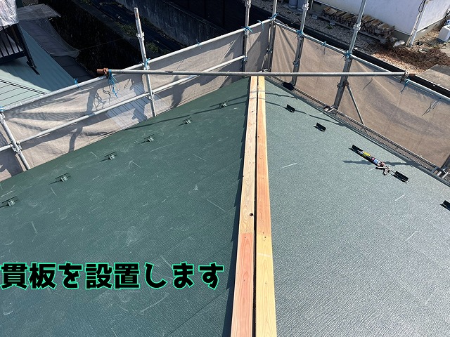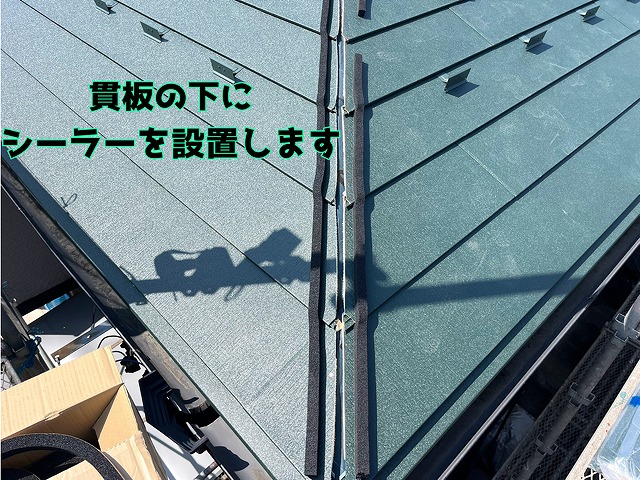 棟からの雨の浸入を防ぐため、防水シーラー(スポンジ製)を貼付けたあと、貫板(ぬきいた)を設置します。