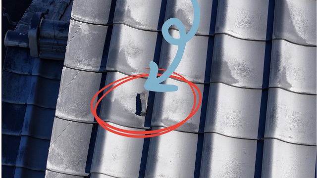 鬼瓦の下にある“のし瓦(横に積み重ねる平たい瓦)”が、経年劣化で抜け落ちていたんです。