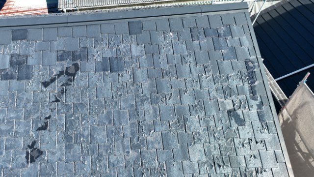 屋根を空から確認すると、表面の塗装がところどころ剥がれ、色褪せや細かい傷みも多数見られました。