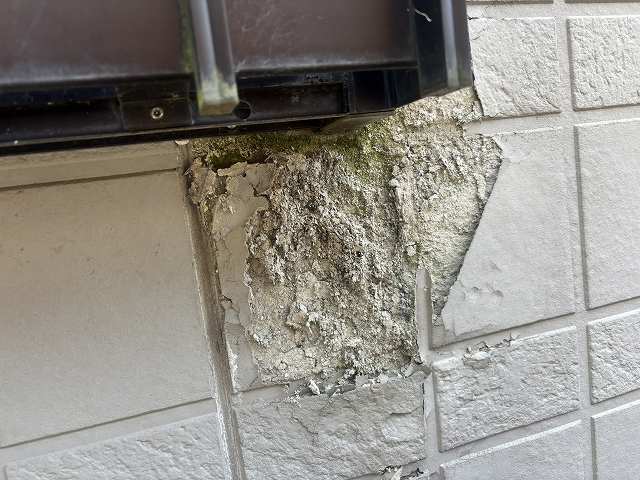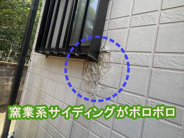 窓周りはシーリング切れや取付部からの雨水侵入も起きやすい場所なので、そこからじわじわ漏水して、サイディングの芯材(セメント)が水を吸って劣化・ボロボロ化してしまった可能性が高いです。