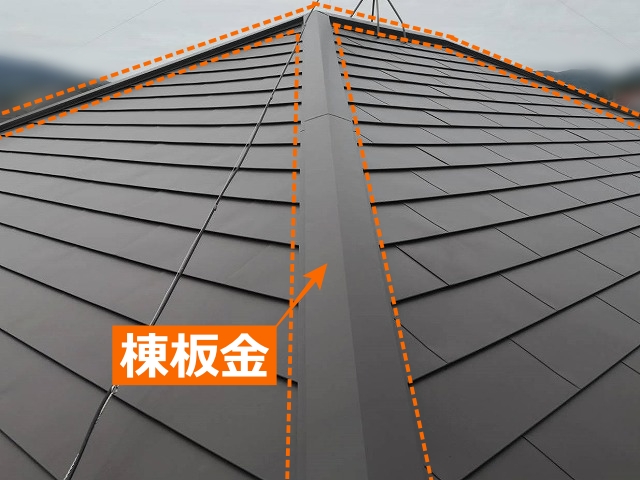 2つの斜めに傾斜した屋根面が交差する部分である「棟」は、屋根面と屋根面の合わせ目には若干の隙間があくため、「棟板金」で覆って雨水が建物内部に侵入するのを防いでいます。