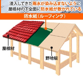 「防水紙(ルーフィング)」という屋根の二次防水もあります。