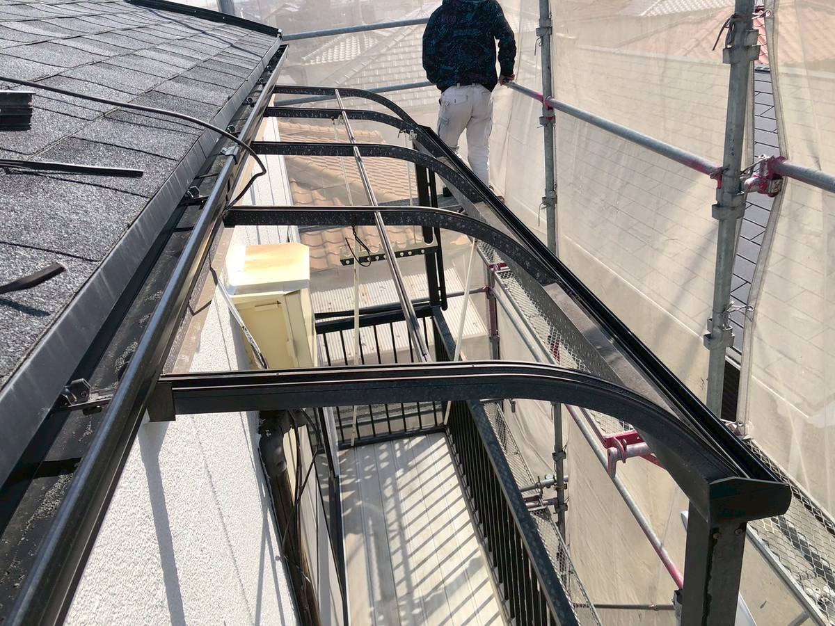 古いポリカーボネートを取り外し、骨組みだけになったベランダの屋根部分。