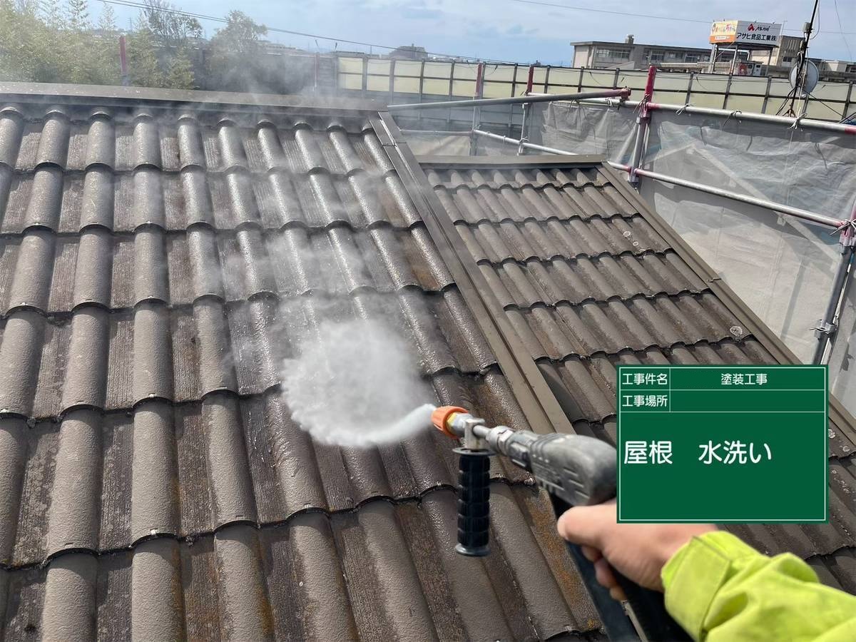 高圧洗浄機を使用して、屋根表面の汚れやコケ、古い塗膜を丁寧に落とします。