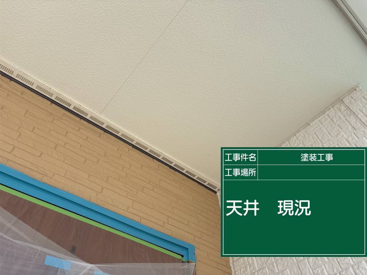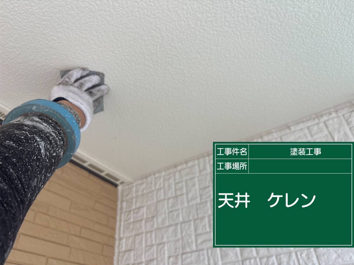 天井のケレン作業で汚れや劣化した塗膜を丁寧に削り落とし、再塗装の準備をしています。