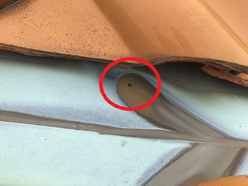 瓦屋根に銅製の谷を併用するとこの様に穴が空く現象が起きます。