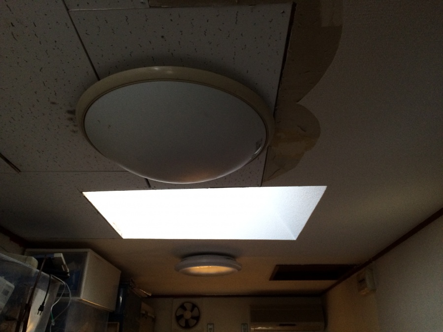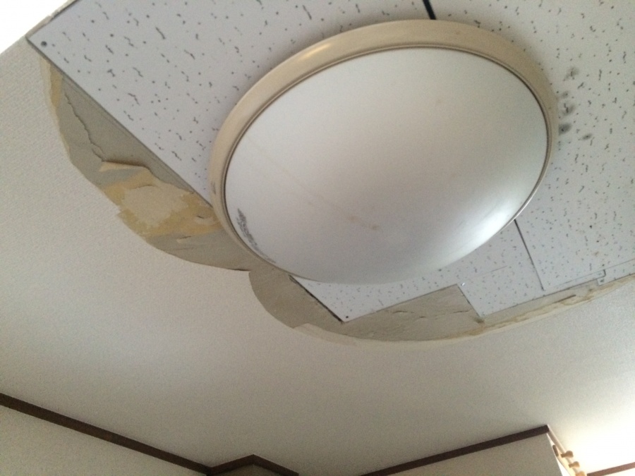 シーリングライトの周りの天井に雨漏りによる補修が見られます。