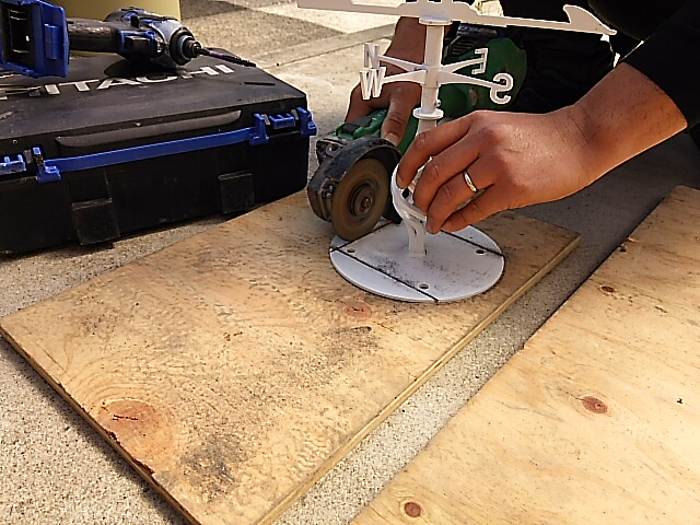 下の取付け部分が稼働式で三角の棟に取付けやすい風見鶏もあるのですが、今回は下が水平タイプの風見鶏です。