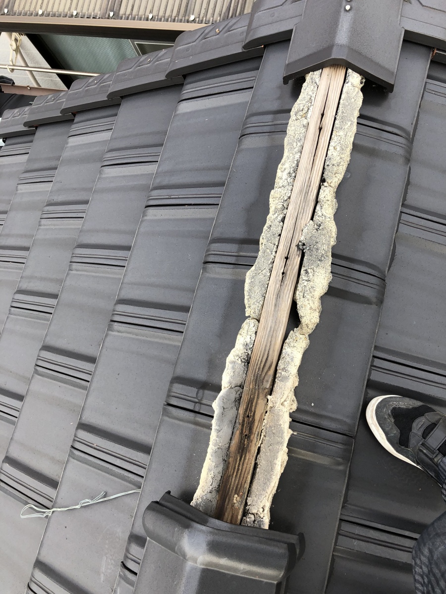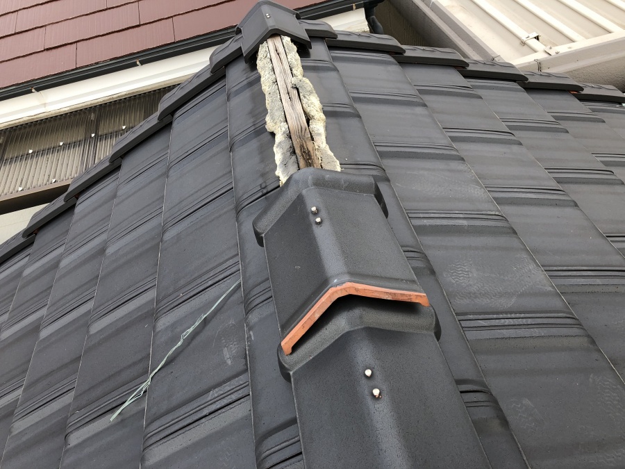 写真をご覧いただければ解る通り棟瓦の部分が飛散してしまっています。