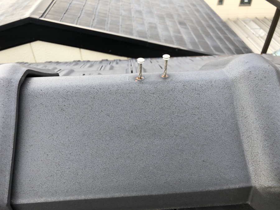 ご覧いただくと解る通り、棟板金を止めるためのビスが完全に浮いてしまっているのが解ると思います。