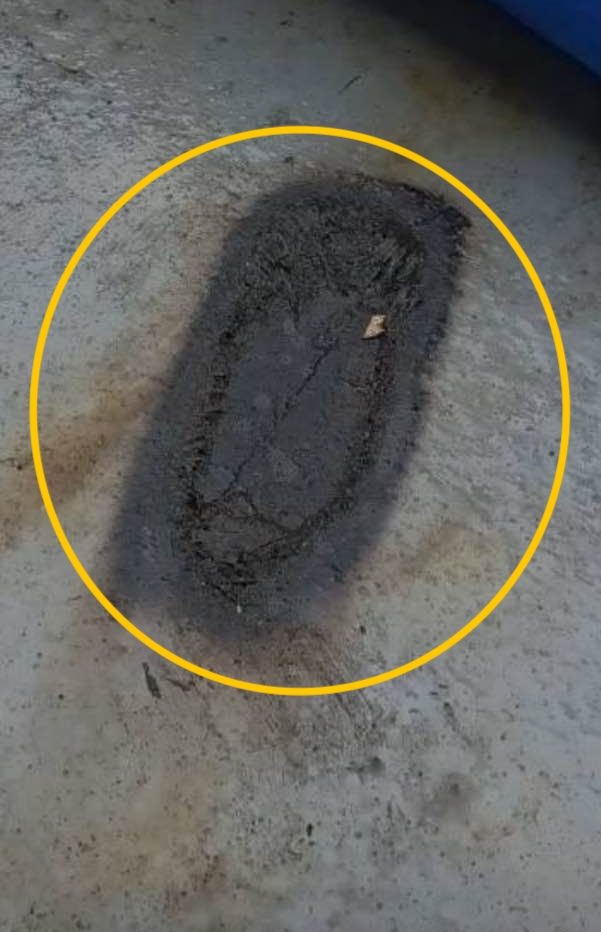 床の一部に、何かが燃えたような「黒い焦げ跡」があり、その中心には小さな穴が開いていました。