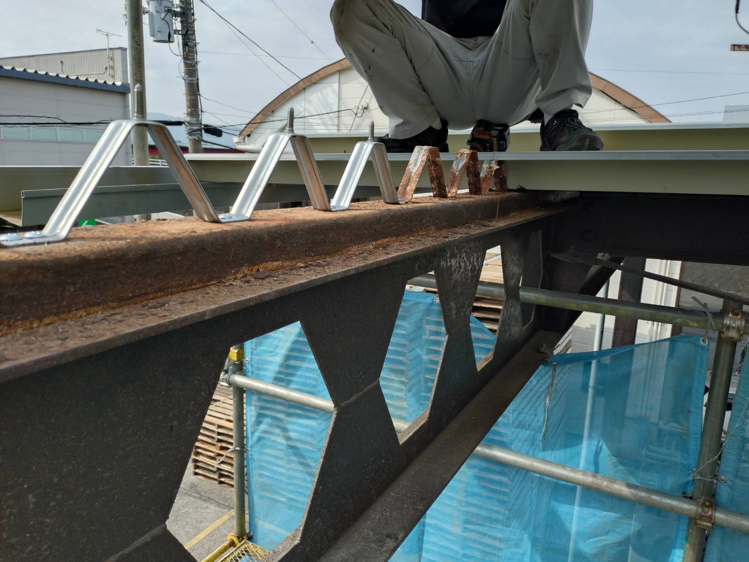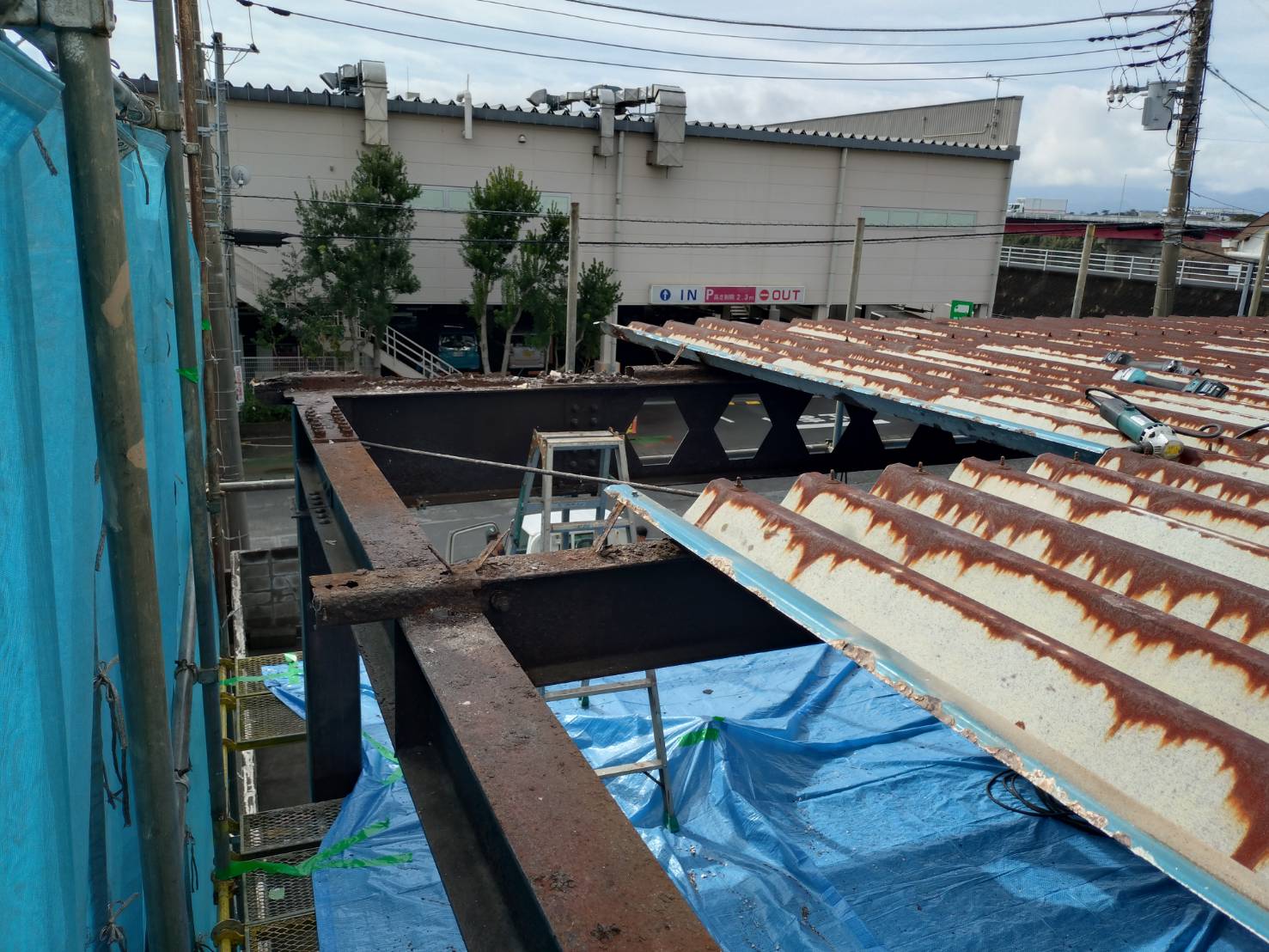 古い折板屋根を撤去し、結合部のタイトフレームの錆び状況も確認し、交換すべき部分は交換します。