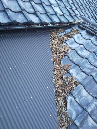 谷樋に落ち葉が積もると、雨水の流れが滞留し、まるで小さなダムのような状態になります。