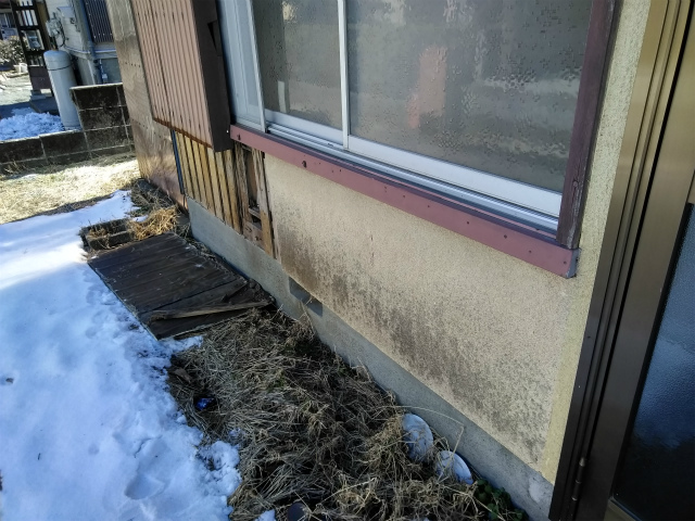 現地で確認すると、雨戸の下部分の外壁に大きな異変がありました。
