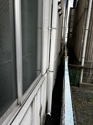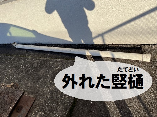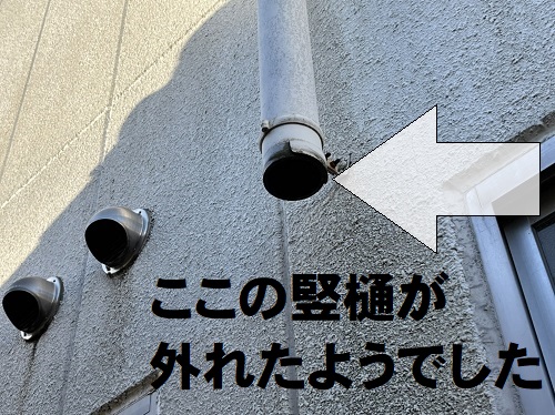 2箇所の竪樋(たてどい)に不具合があるようでしたが、1箇所目は竪樋が外れてしまっていました。