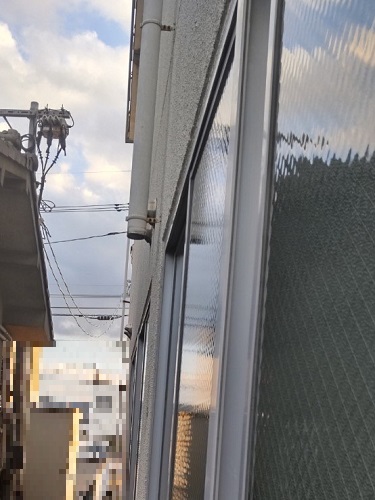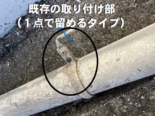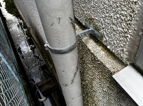 元々、竪樋の取付けは外壁に1点で留めていましたが、今回は補強のために4点でビス留めしていきます。