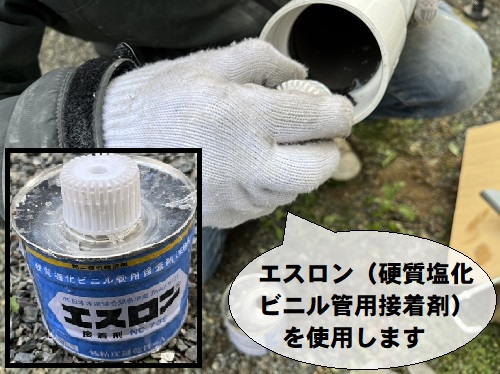 カットしたほうの竪樋にソケットを取り付けましたら、エスロンという硬質塩化ビニル管用接着剤を塗ります。