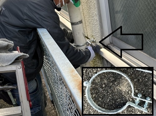 福山市にて会社敷地内の外れた竪樋(たてどい)の補修・固定作業