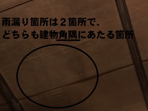 室内の天井には雨漏り痕がくっきりと残っていました。その雨漏り痕は2箇所あり、どちらも住宅の角隅にあたる箇所でした。