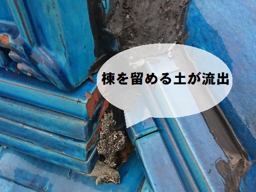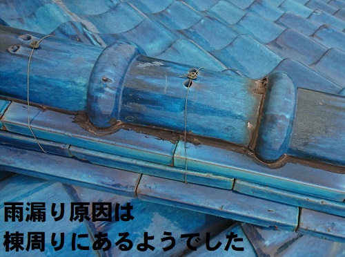 熨斗瓦の山が平たくなってきており、状況から考えて雨水が棟の内側に向かって流れていると思われました。