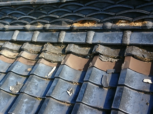 全体的に瓦屋根の瓦にずれが生じており、何度か屋根補修をした様子が目立ちました。