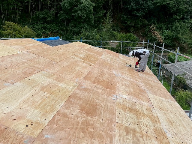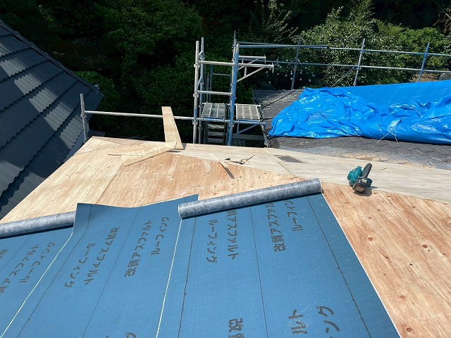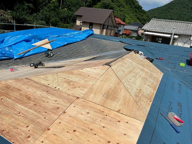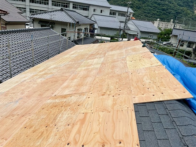 既存のスレート屋根の上に新たに構造用合板を重ねて下地を作りその上に防水シートを施工しました。