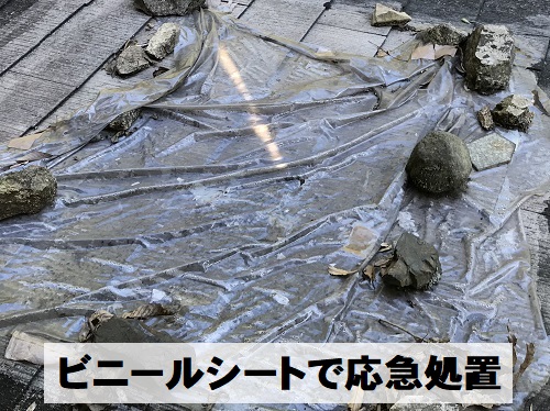 お客様自身で応急処置としてビニールシートを設置されたそうです。しかし、その応急処置もすぐに限界を迎えていました。