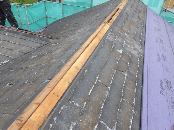 貫き板に釘で固定してある既存棟板金を取り外し、野地板に固定してある貫き板を撤去していきます。