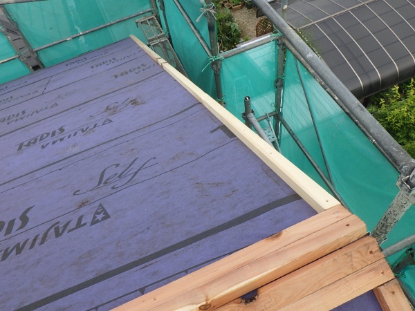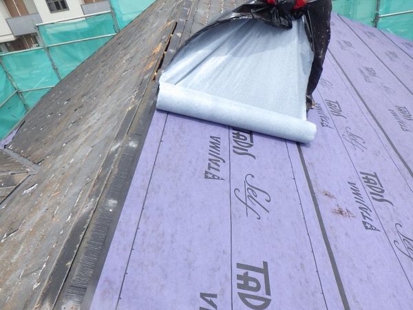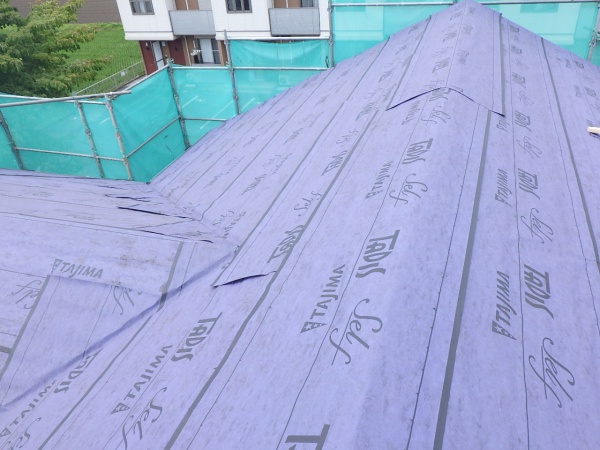 アスファルトルーフィングの貼り付け中です。