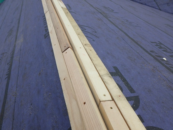 棟板金下地は棟の芯に墨を引き、左右に30×40ミリの垂木を2本ずつ、既存野地板にビスで固定しました。